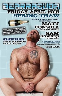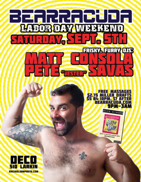 San Francisco, CA 2009 Guardian Best Club Winner - Bearracuda presents it's annual Labor Day Extravaganza with dj's Matt Consola & Pete "Jester" Savas9p – 3a @DECO - 510 Larkin Street, SF $5.00 before 10pm / $7.00 After 10PM