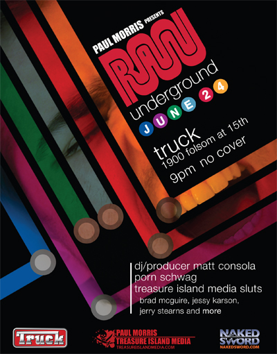 San Francisco, CA Paul Morris presents; RAW Underground. Treasure Island Media & NakedSword Pre-Pride Event for the public. Porn Schwag and Treasure island Media Sluts Brad McGuire, Jessy Karson, Jerry Stearns, and more.