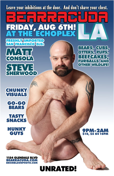 Los Angeles, CA Bearracuda presents a Night of Furry Men & Mayhem with DJ's Matt Consola and Steve Sherwood. Chucnky Visuals, Go-Go-Bears, Tasty Snacks, Hunky Guys